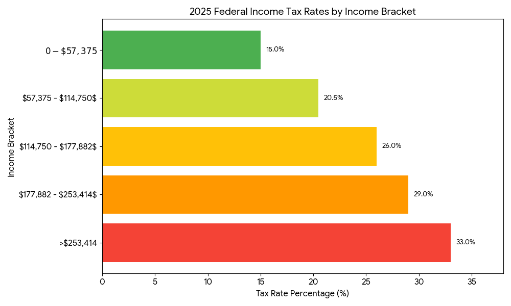 Apply the Federal Income Tax Rates (tax brackets) to your taxable income. Canada uses a progressive tax system, meaning higher income portions are taxed at higher rates.